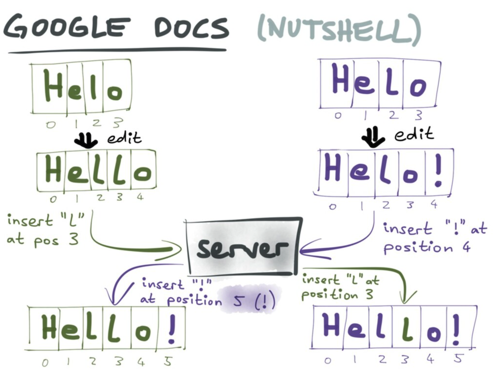 간단 예로 가정하자면, 온라인에서 어떤 문서를 편집하고 있는 상황이다. 이 문서는 클라이언트(우리 컴퓨터)와 서버에 모두 저장되어 있다. 문서 내용을 바꾸면, 변경사항은 먼저 클라이언트에 적용되고, 그 다음에 서버에 전송된다. 그럼 사용자는 변경사항이 즉시 적용된 것처럼 느낄 수 있는데, 이런 걸 '옵티미스틱 업데이트'라고 부른다. 그런데 문제는 우리가 문서를 편집하는 동안 서버 측의 문서도 바뀌었다면, 우리가 전송한 변경사항과 서버의 변경사항 사이에 충돌이 일어날 수 있다는 것이다. 이런 경우엔 충돌을 해결해줘야 한다.