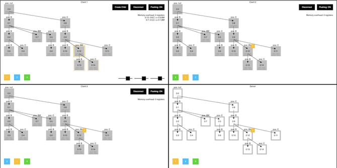 피그마는 가설의 빠른 검증을 위해 코드 베이스 환경에서의 작업보다 프로토타입 환경을 통해 아이디어를 테스트함을 택했다. 웹 페이지에는 세 개의 클라이언트가 서버에 연결되어 있고, 시스템의 모든 상태를 시각화해준다. 이 프로토타입 환경을 통해 오프라인 클라이언트, bandwidth 제한된 연결 등에 대한 다양한 시나리오를 쉽게 설정하고 테스트해볼 수 있다고 한다. (아래는 internal 프로토타입의 스크린샷)